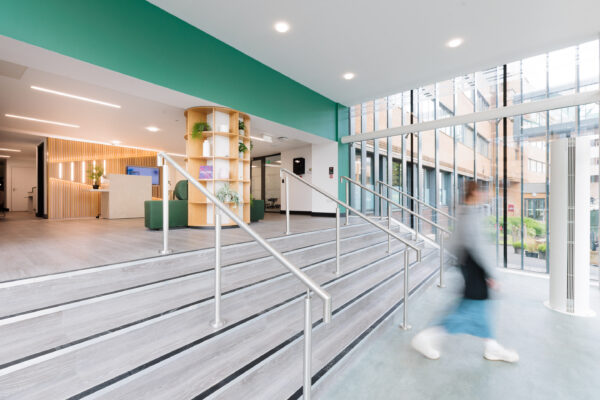 The transformation of Alderley Park’s Mereside campus creates an inspiring and desirable environment for tenants. Key elements such as light stone and timber harmonise with the natural surroundings, and rich, warm finishes, complemented by block colours echo the local landscape and add depth and vibrancy to the spaces.
