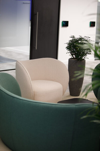 • Vibrant blues, bold accents and natural greenery introduce warmth and energy, helping the workplace feel bright, balanced, and uplifting.