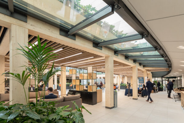 In addition to being an ideal choice for its structural benefits and climate credentials, timber was also a perfect material candidate for its natural warmth, deliberately contrasting with the steel, concrete, glass, and fabric of the listed structure.